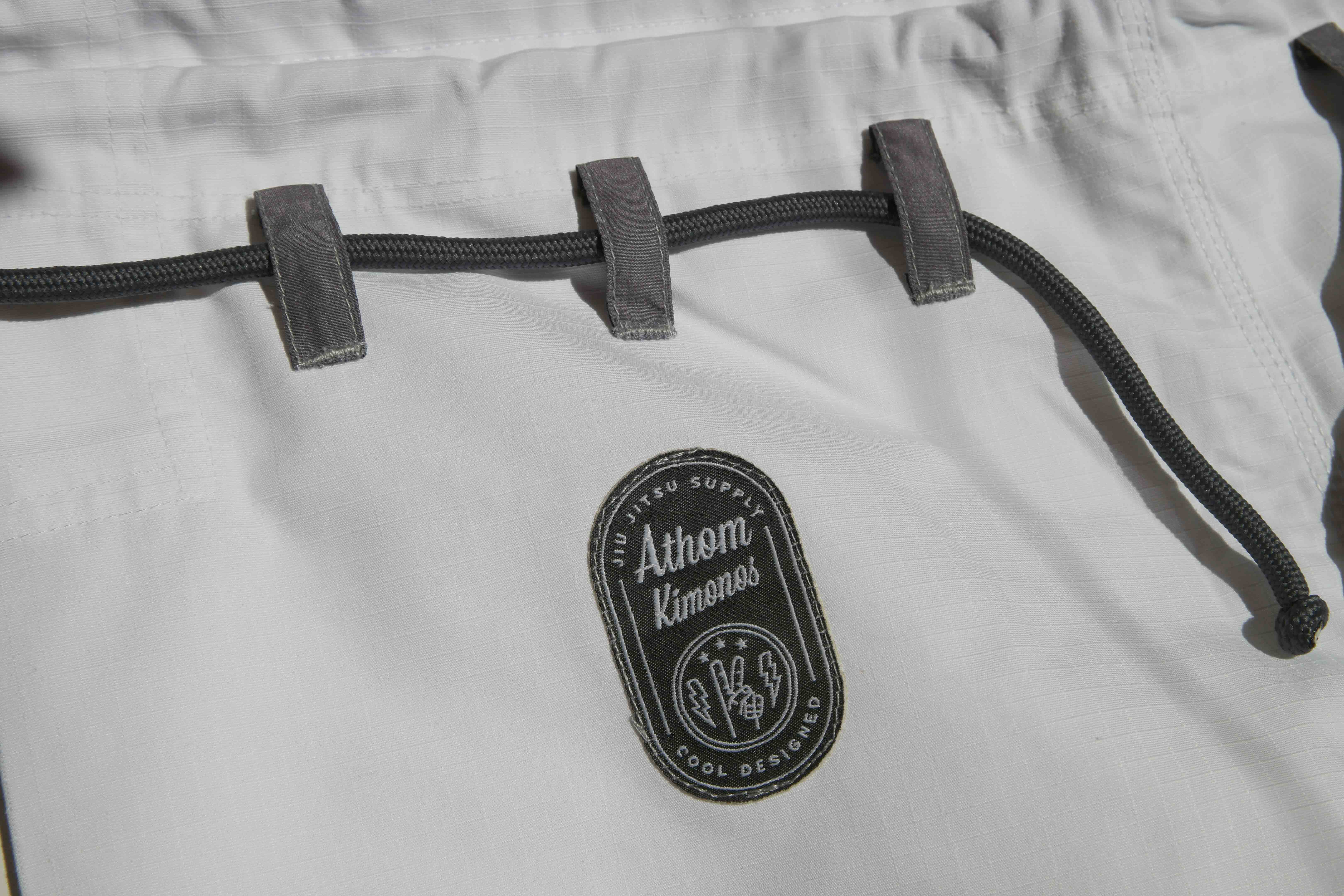 Le design de ce kimono est travaillé aussi bien sur l’harmonie des couleurs que sur les détails. Première chose : la coupe au niveau de la jupe de la veste. Au lieu d’être une coupe à angles carrés classiques, ATHOM a choisi de les arrondir. Ce n’est qu’un détail, mais cela donne un aspect particulier pour ce gi. J’ai reçu la version blanche aux détails gris clair avec le logo brodé sur chaque manche et le nom de la marque brodée également sur les côtes. Il comporte également d’autres détails cousus tels que des étiquettes en haut et en bas du col, une doublure intérieure et les bandes de renforcement. J’ai également un petit faible pour la version noire/rose clair de ce modèle.