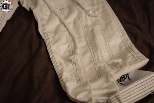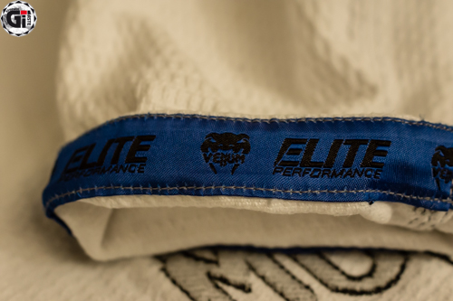 Lorsque l’on sort le Kimono de son sac, ce qui frappe c’est la blancheur ! Cela fait bien longtemps que je n’avais pas vu une telle blancheur ! Le Gi est blanc avec des liserés bleus et une surpiqure grise du plus bel effet ! On retrouve 3 broderies sur la veste (la tête du cobra en haut du dos, Venum dans le bas de la veste, et à nouveau Venum sur le côté gauche de la veste). 2 Patchs sur les épaules toujours au nom de Venum…bref on sait quelle marque on porte (on retrouve les mêmes patchs d’ailleurs sur les côtés du pantalon). Le dos de la veste permet quand même de mettre le patch de votre académie.