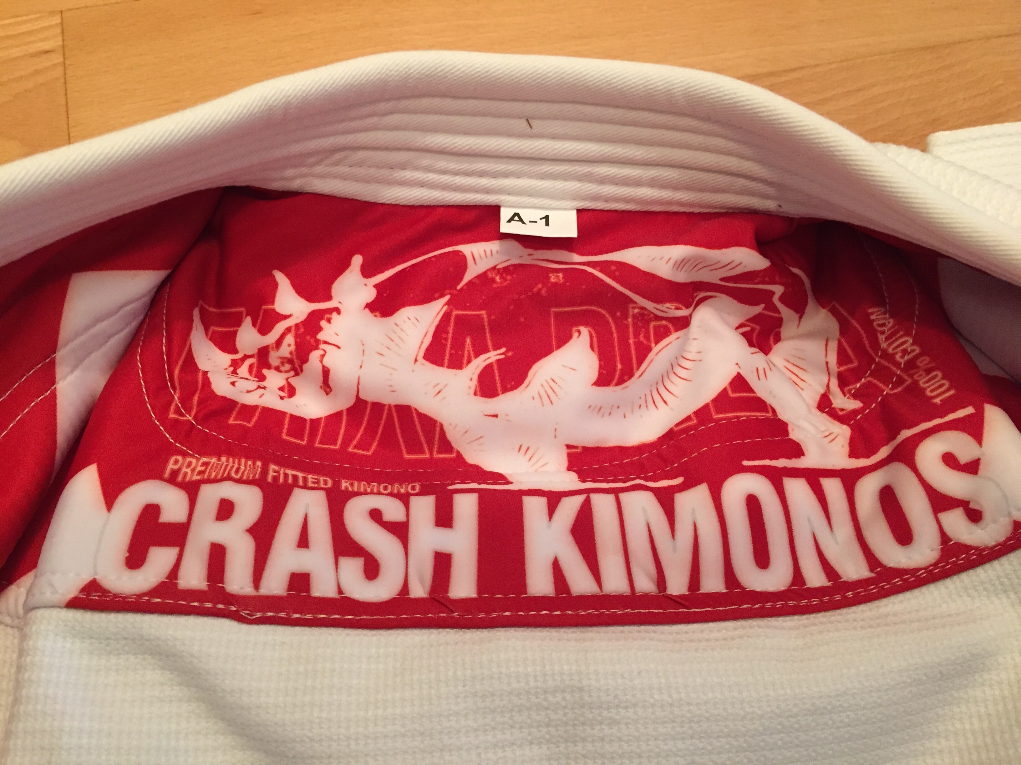 Le nom de la marque est un mix entre la passion d’Abram pour les tatouages, sa fille qui a toujours marmonné Rhinocéros (CRASH est une famille de rhinocéros)…à l’origine le nom devait être Crash Brazilian JiuJitsu Gi Company mais après en avoir discuté avec ses amis dont son professeur Roberto MAIA, ils ont trouvé que Crash Kimonos était plus direct.