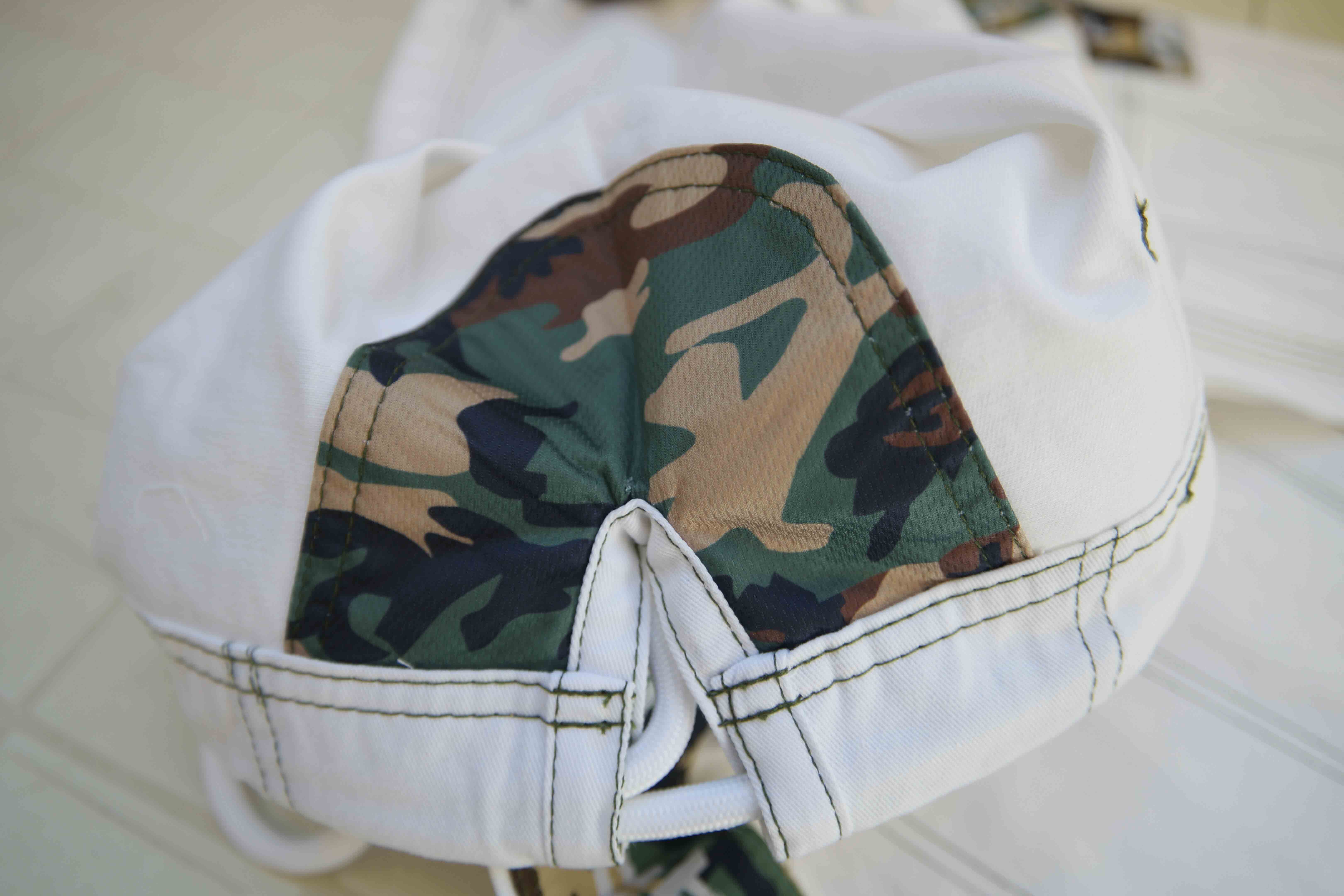 Comme cité plus haut, le tissage donne un aspect assez particulier à la veste. Le design est élaboré sur ce kimono pour donner un thème assez militaire : des surpiqûres vert militaire, une broderie est située sur l’arrière du col, des patches vert camouflage sur les épaules, sur le bas du col, sur l’arrière du col, sur la poitrine et enfin sur le bas arrière de la veste. A l'intérieur de la veste, on a ici un tissu synthétique, du même vert camo, recouvre les épaules et le haut du dos et renforce les fentes latérales. Ce tissu alvéolé est très doux au touché. Je l’ai déjà vu employé sur certains t-shirts techniques de running.
