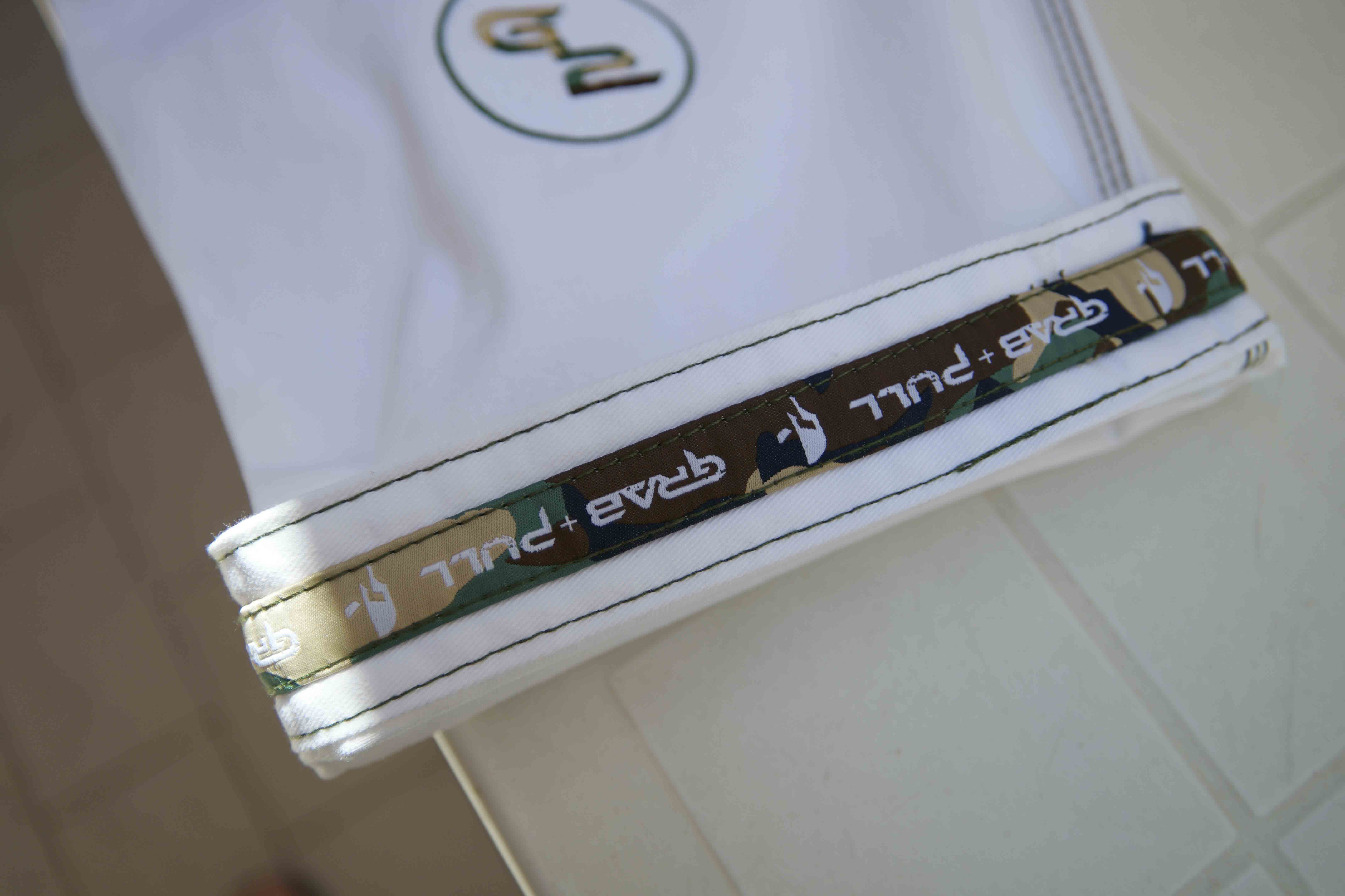 Notons que ce kimono dispose tout de même d’un nombre important de patches (7). Personnellement j’ai eu pas mal de problèmes de patches qui se détachent sur d’autres marques. Ici, on voit que les concepteurs ont pensé à ce problème qui s’avère être récurrent. Déjà l’épaisseur des patches est inhabituellement plus épaisse, ce qui leur confèrent une résistance plus grande. Tous les patches ont été surpiqués deux fois, pour éviter tout détachement. J’ai trouvé ça très bien vu de la part de Grab & Pull. Le bord des patchs est également plus dur, je pense qu’un traitement à chaud à été fait sur chaque patches, afin d’éviter qu’ils ne s'effilochent