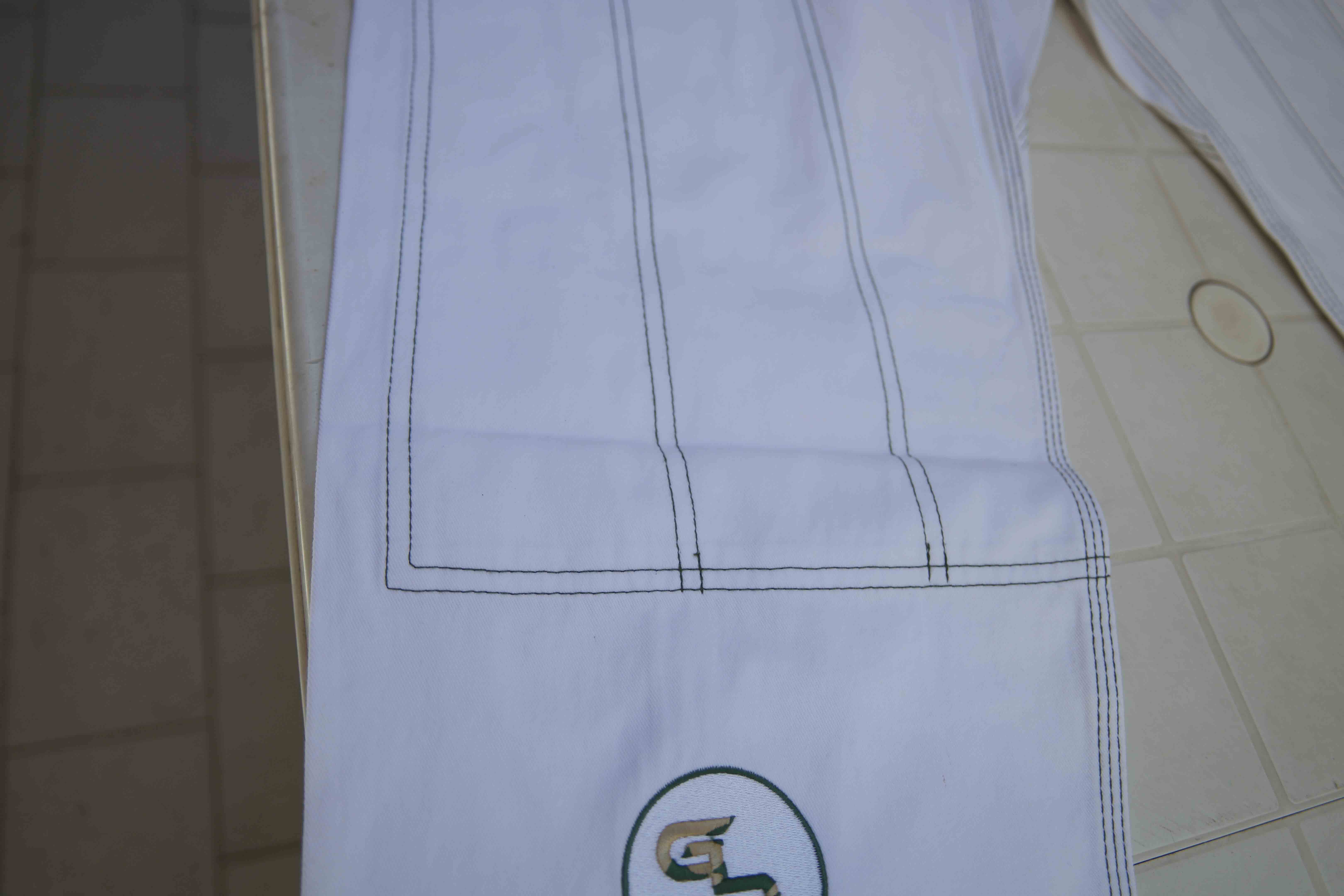 Le gi comporte pas mal de patchs si bien sur la veste que sur le pantalon, et aussi deux broderies à l’arrière du col et en bas de la jambe droite.