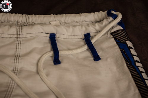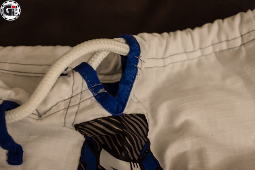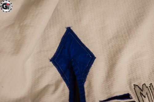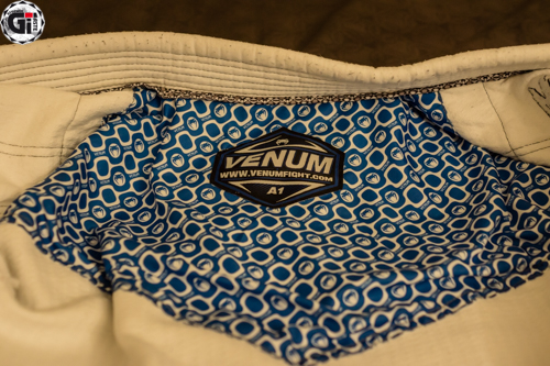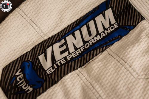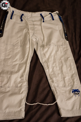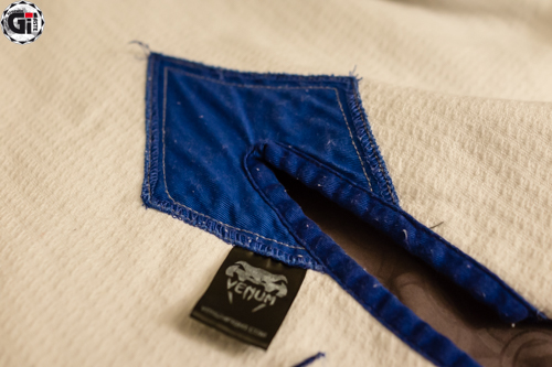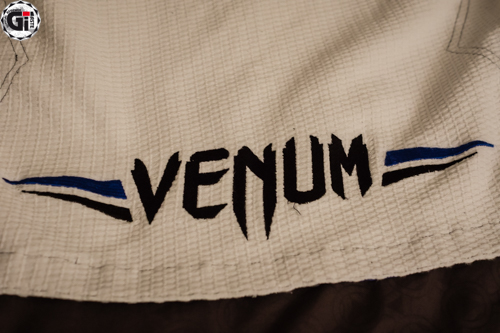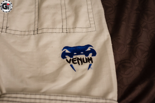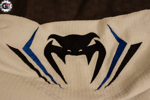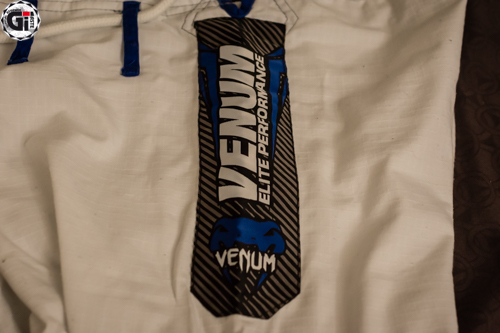 Lorsque l’on sort le Kimono de son sac, ce qui frappe c’est la blancheur ! Cela fait bien longtemps que je n’avais pas vu une telle blancheur ! Le Gi est blanc avec des liserés bleus et une surpiqure grise du plus bel effet ! On retrouve 3 broderies sur la veste (la tête du cobra en haut du dos, Venum dans le bas de la veste, et à nouveau Venum sur le côté gauche de la veste). 2 Patchs sur les épaules toujours au nom de Venum…bref on sait quelle marque on porte (on retrouve les mêmes patchs d’ailleurs sur les côtés du pantalon). Le dos de la veste permet quand même de mettre le patch de votre académie.