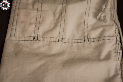 Le pantalon est beaucoup plus simple au premier abord mais tout aussi technique : blanc, renfort intérieur aux genoux, au niveau des chevilles, il y a un renfort plus classique avec plusieurs lignes de coutures. Bref basique mais ultra léger car 100% ripstop