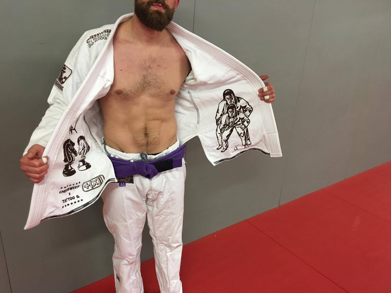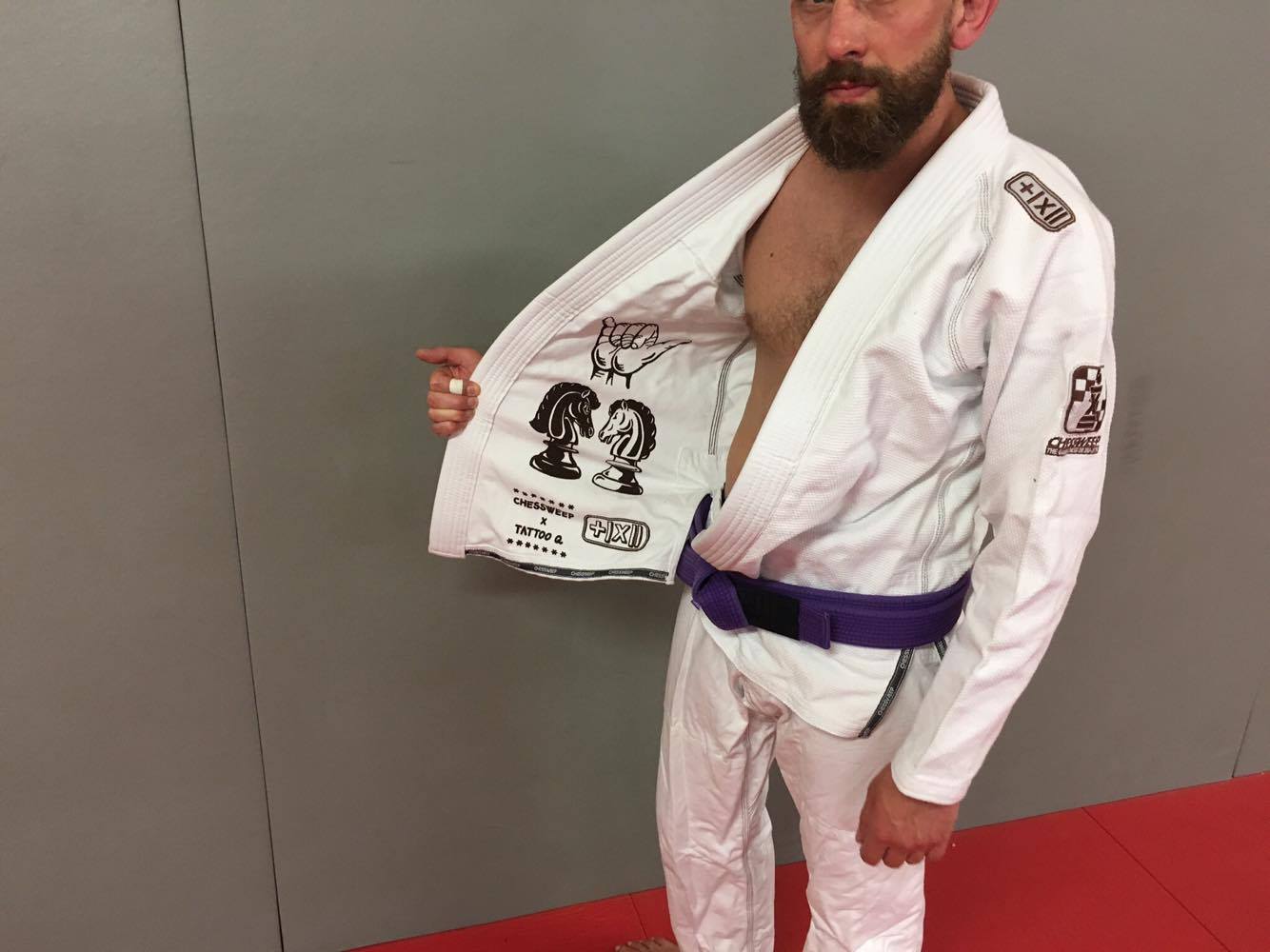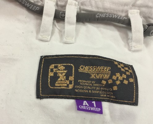 Le gros travail a été apporté sur la veste ,une broderie au nom de la marque et du kimono, 4 patchs reprenant soit le nom Chessweep, soit le thème du jeu d’échec (coloris marron ou violet) , et l’étiquette du lapel en gris foncé et or. Sur le papier, toutes ces couleurs peuvent paraître bizarre mais promis, ca matche grave !