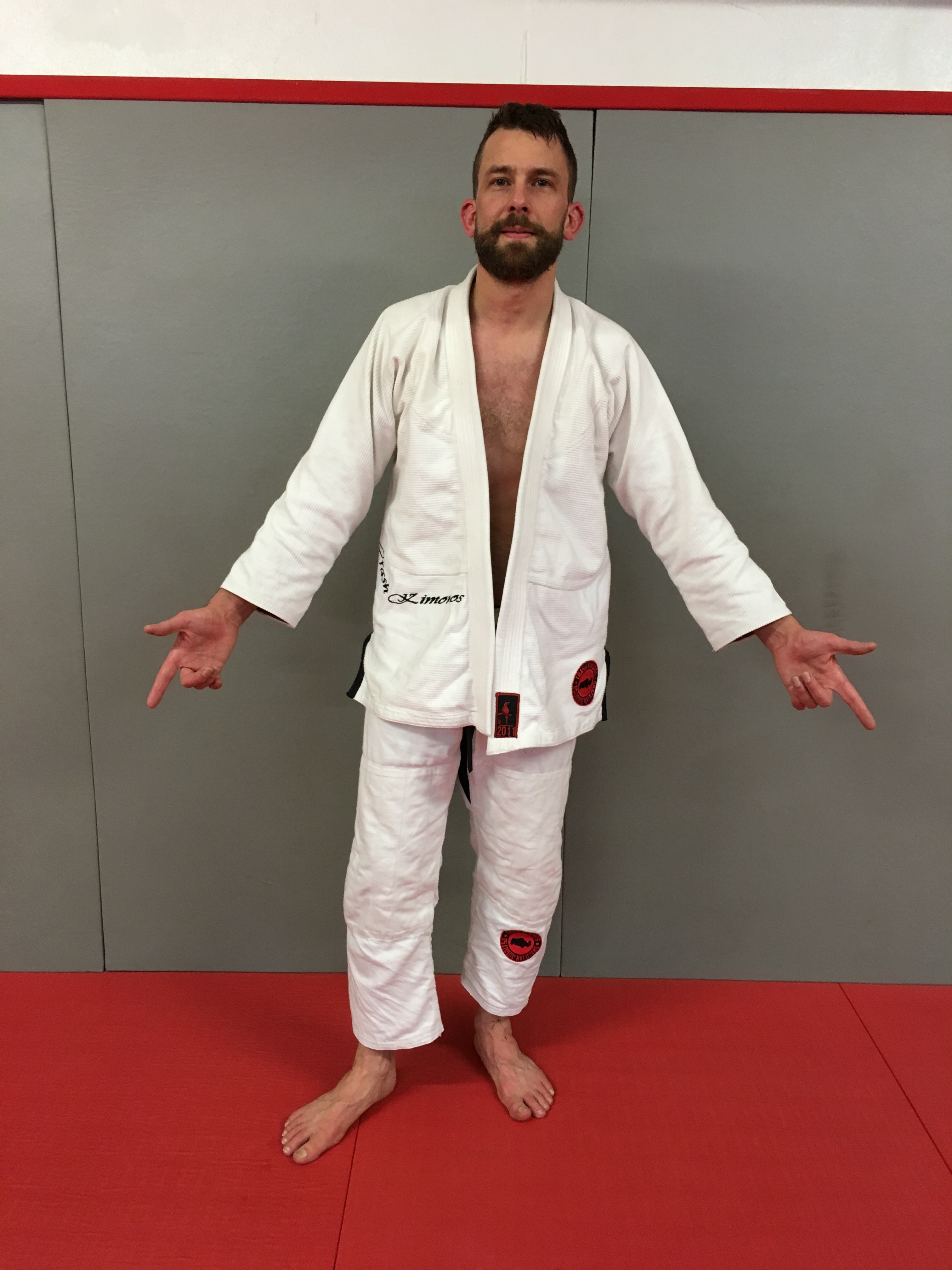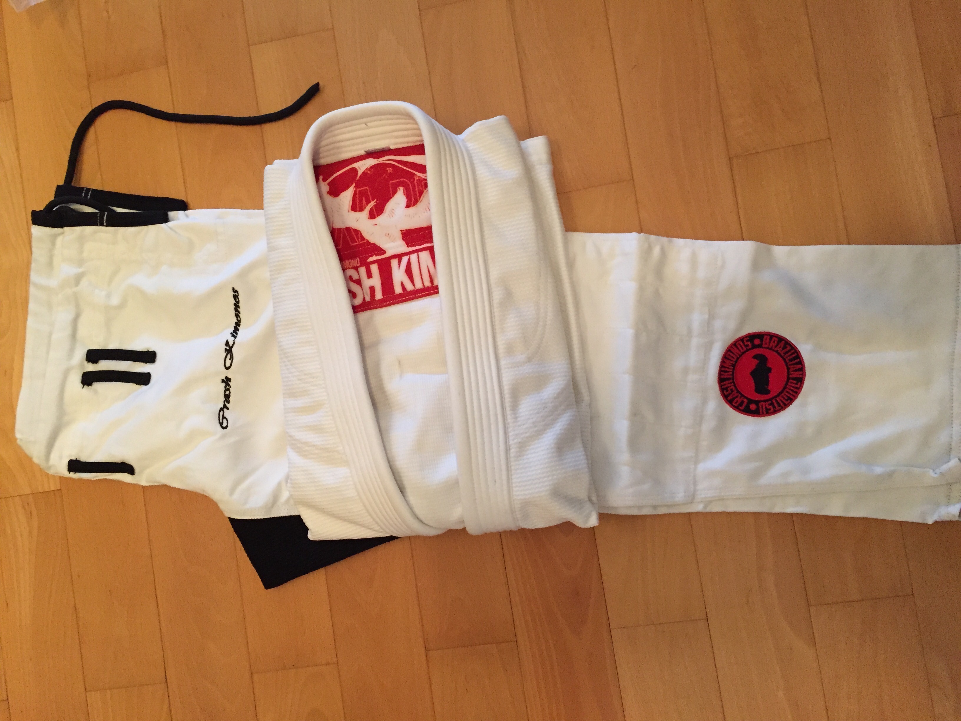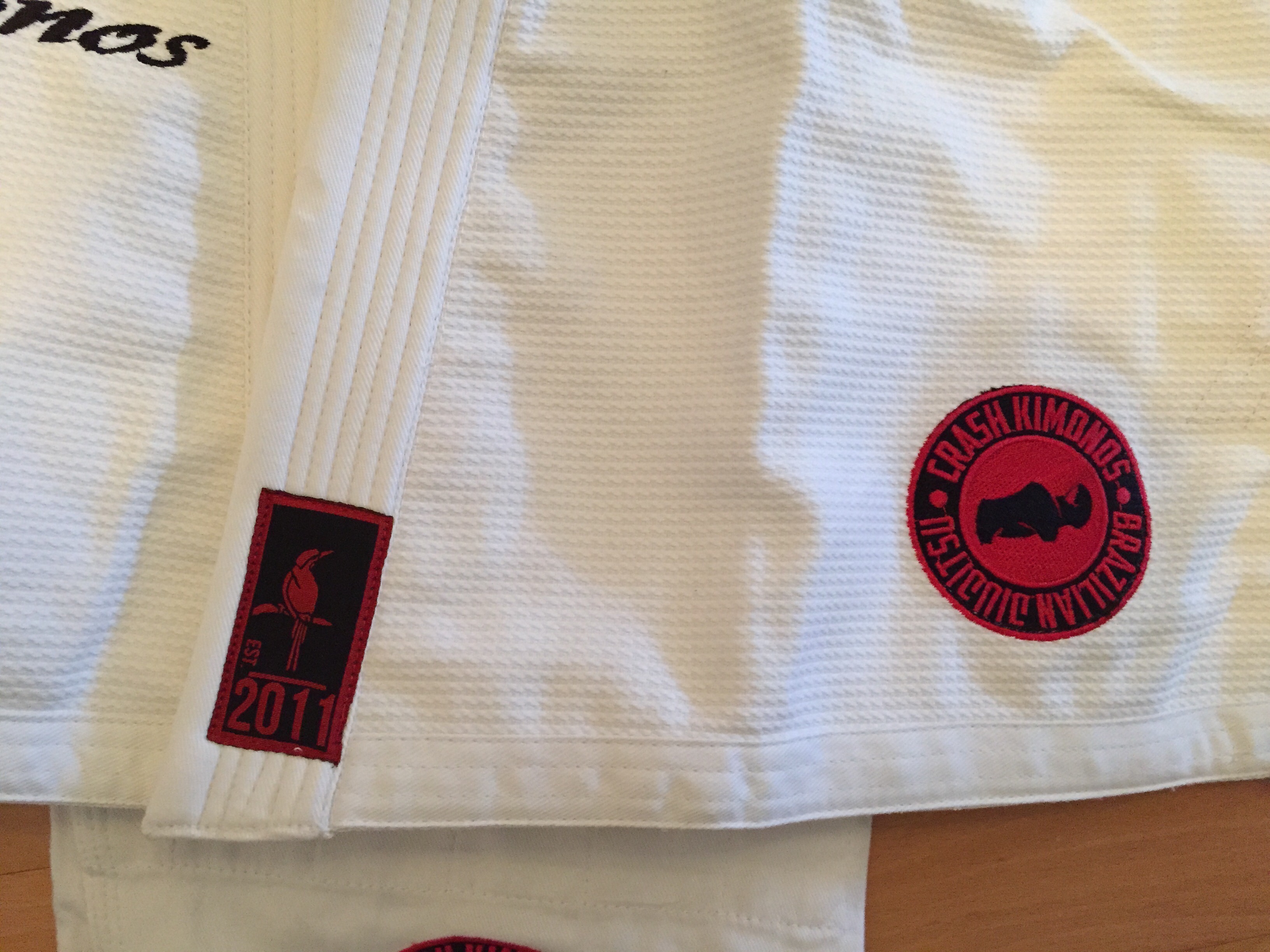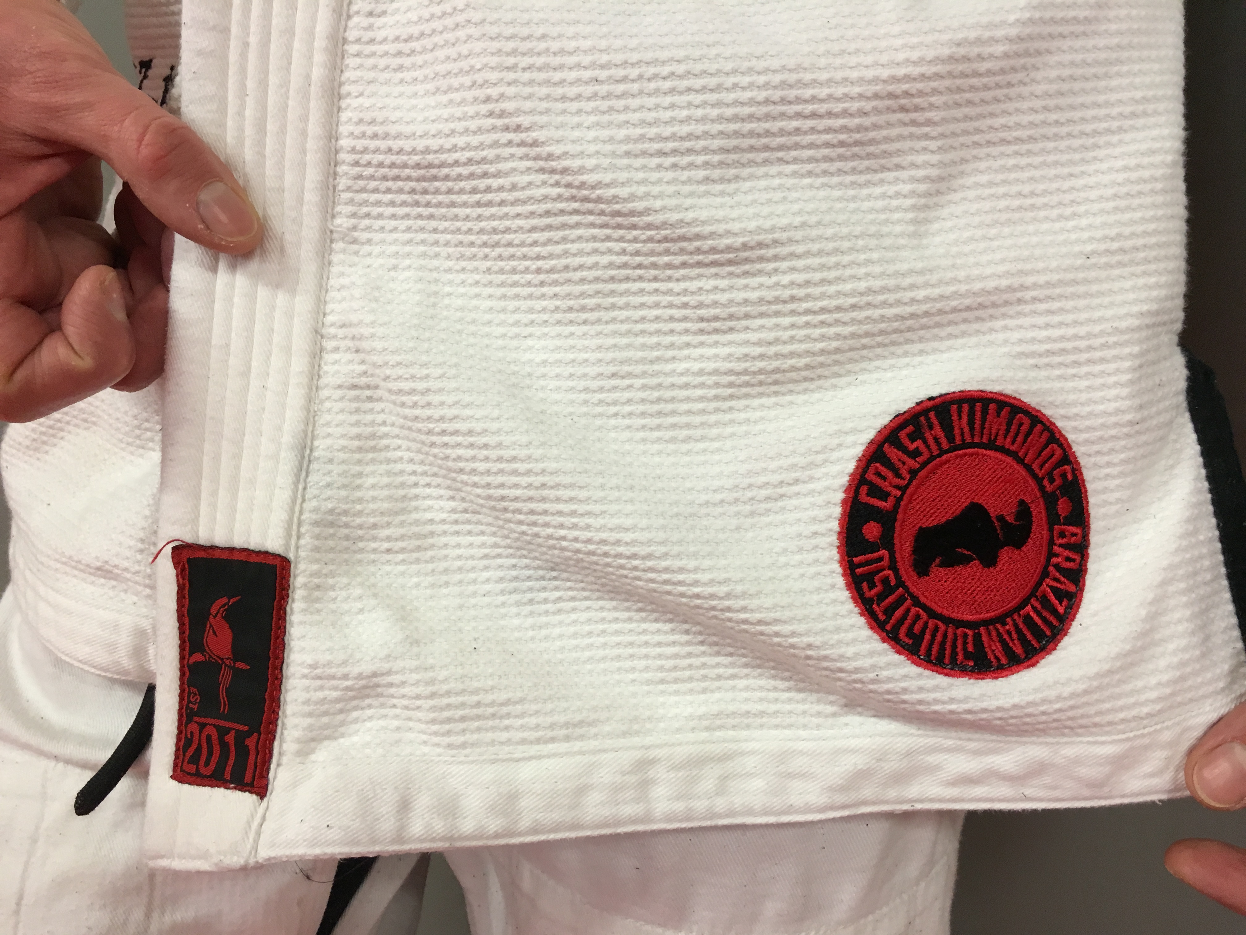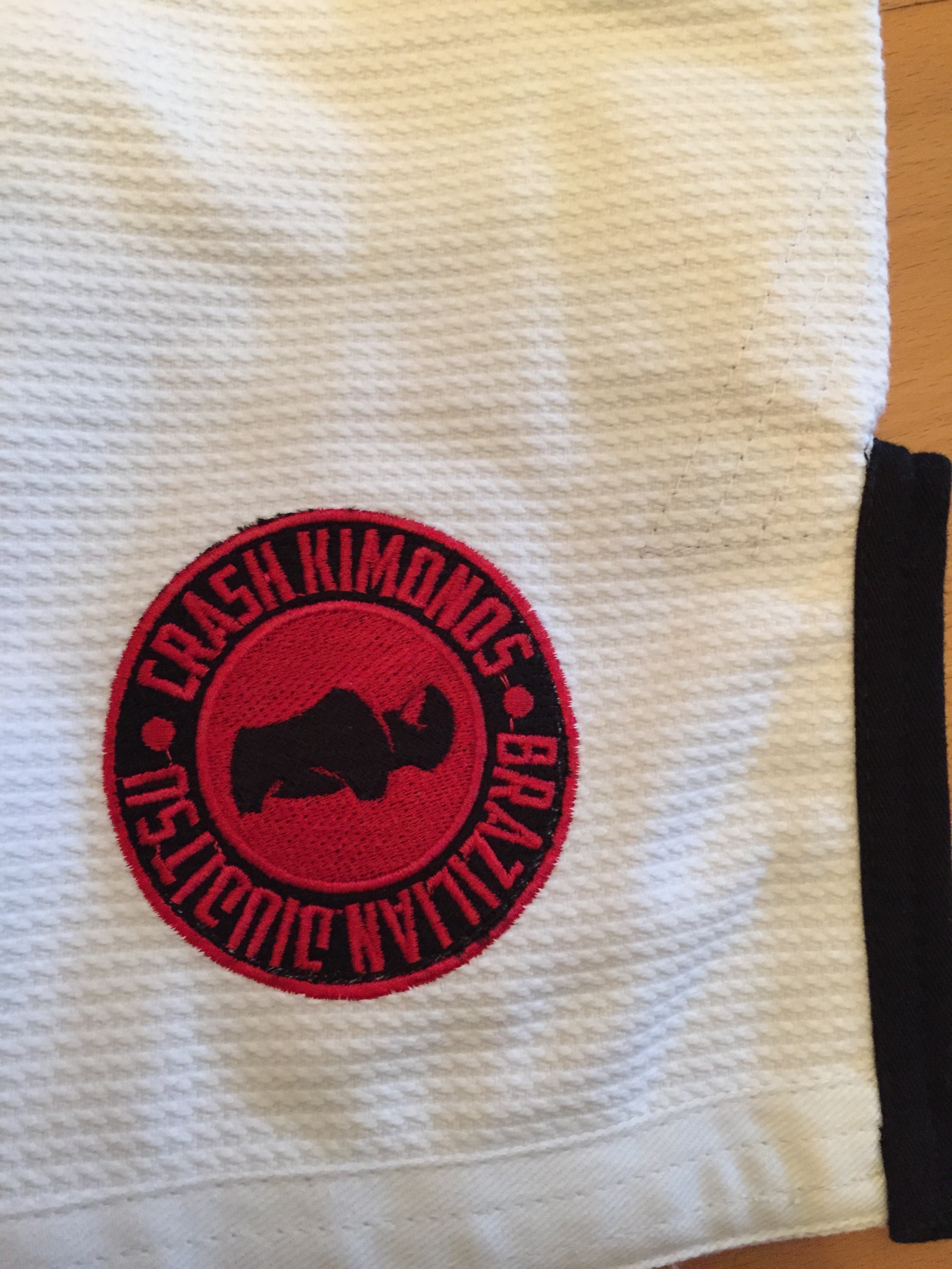 Le nom de la marque est un mix entre la passion d’Abram pour les tatouages, sa fille qui a toujours marmonné Rhinocéros (CRASH est une famille de rhinocéros)…à l’origine le nom devait être Crash Brazilian JiuJitsu Gi Company mais après en avoir discuté avec ses amis dont son professeur Roberto MAIA, ils ont trouvé que Crash Kimonos était plus direct.