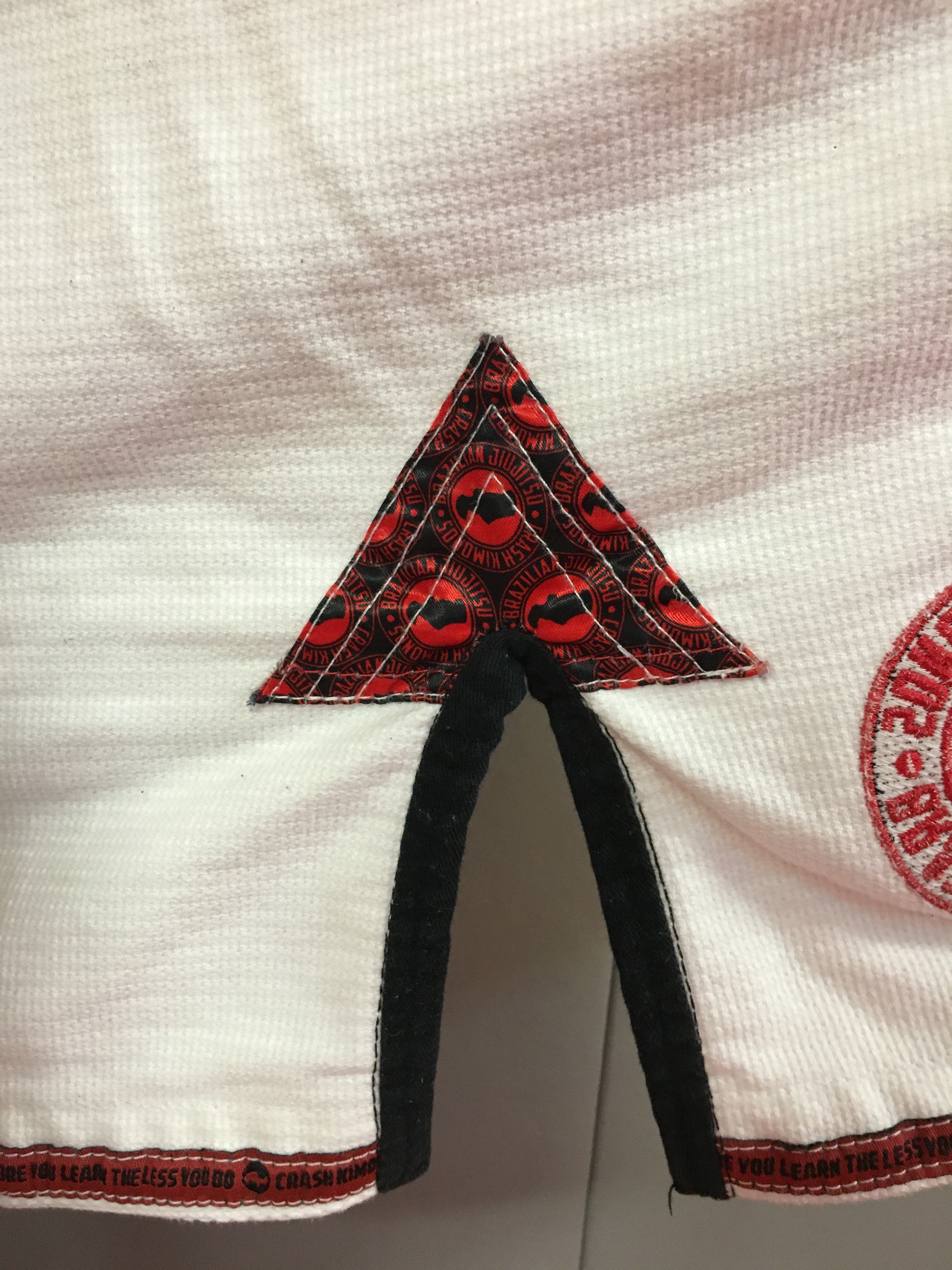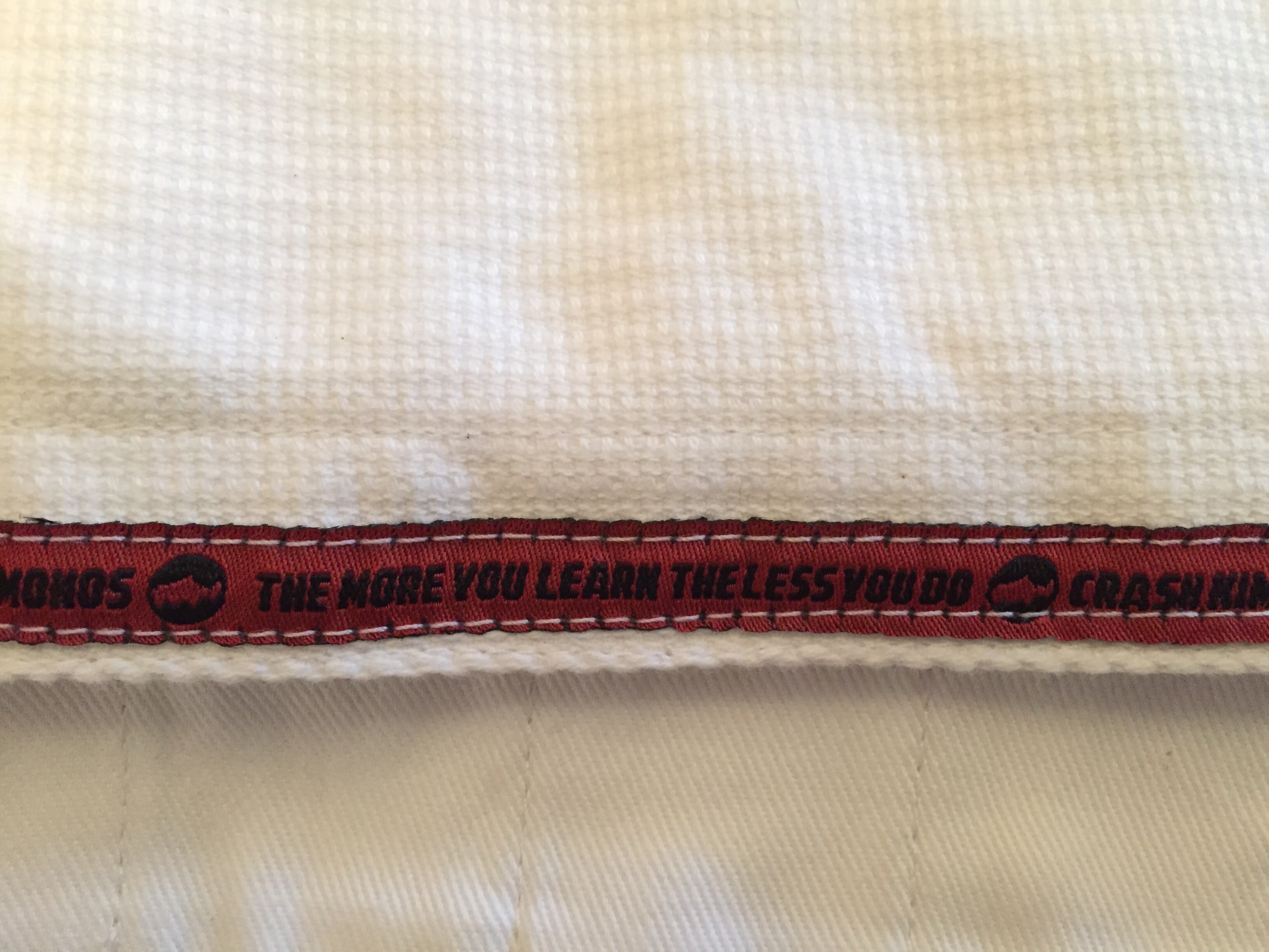 Lorsqu’on enfile pour la première fois la veste, on sent que l’on est sur du coton 550 gsm (alors que de plus en plus de marques utilisent du 450 GSM pour gagner en légèreté) même si on n'a pas l’impression de tourner en Judogi, on sent la différence sur les épaules. Les renforts sont bien présents (triple couture), aisselles, jupe de la veste, dos, entre-jambe, aucun ne manque à l’appel.