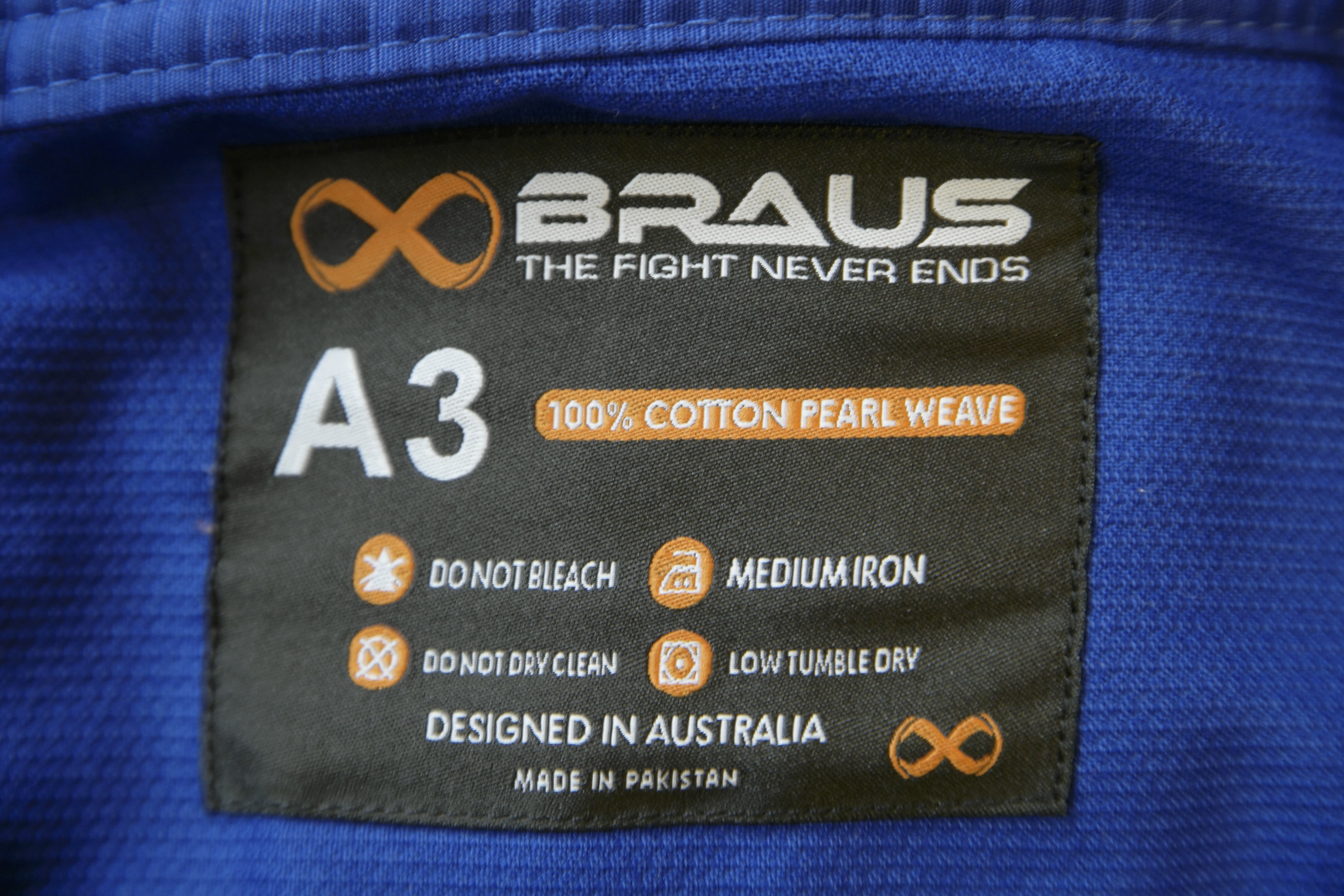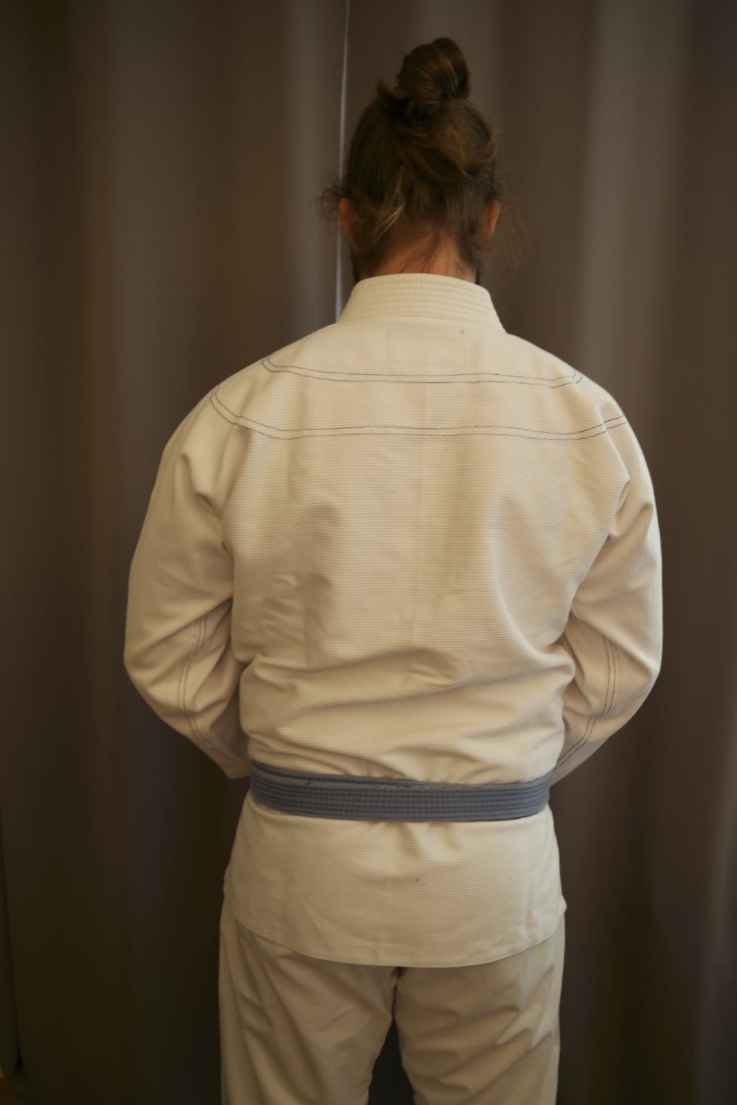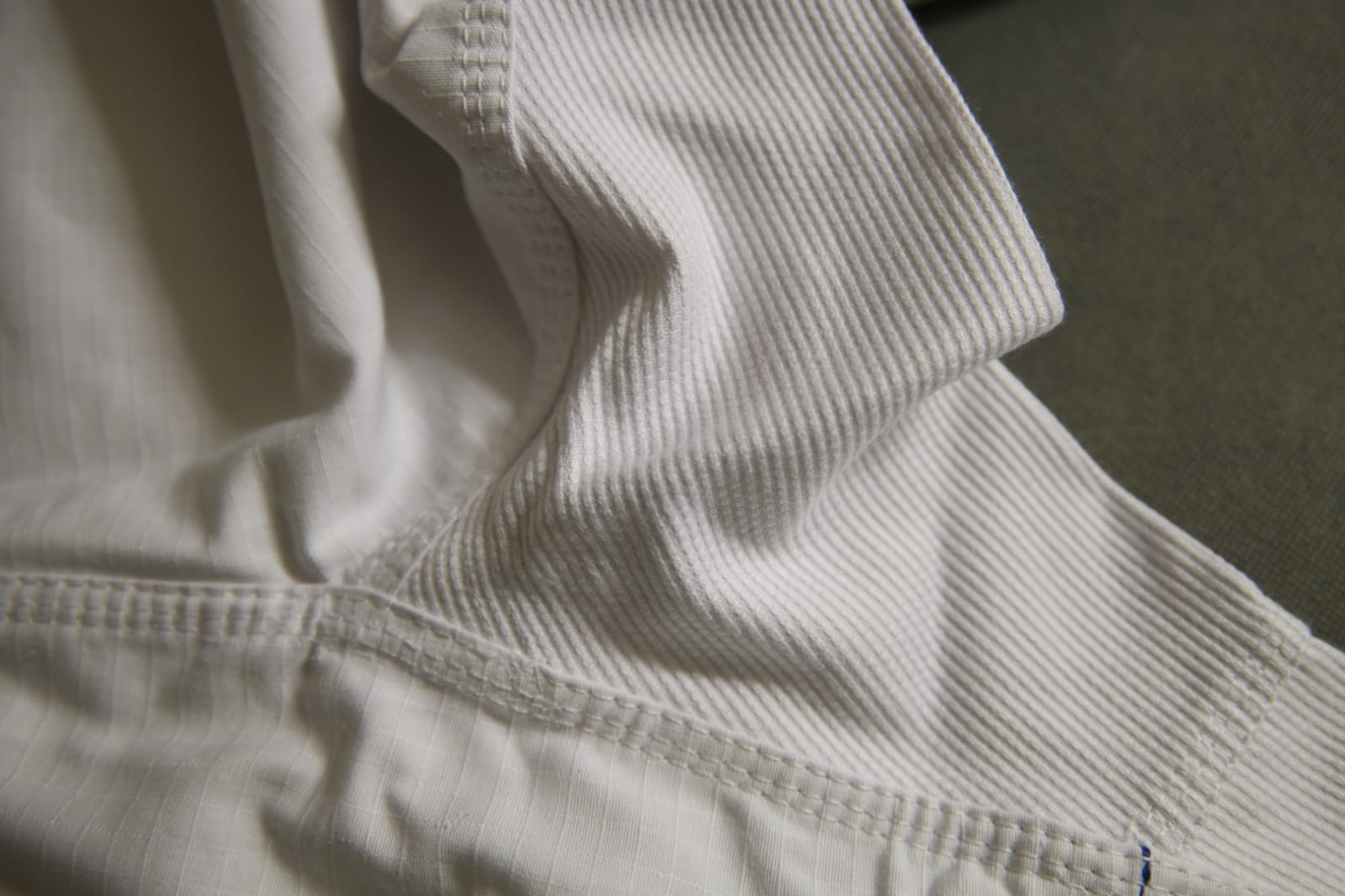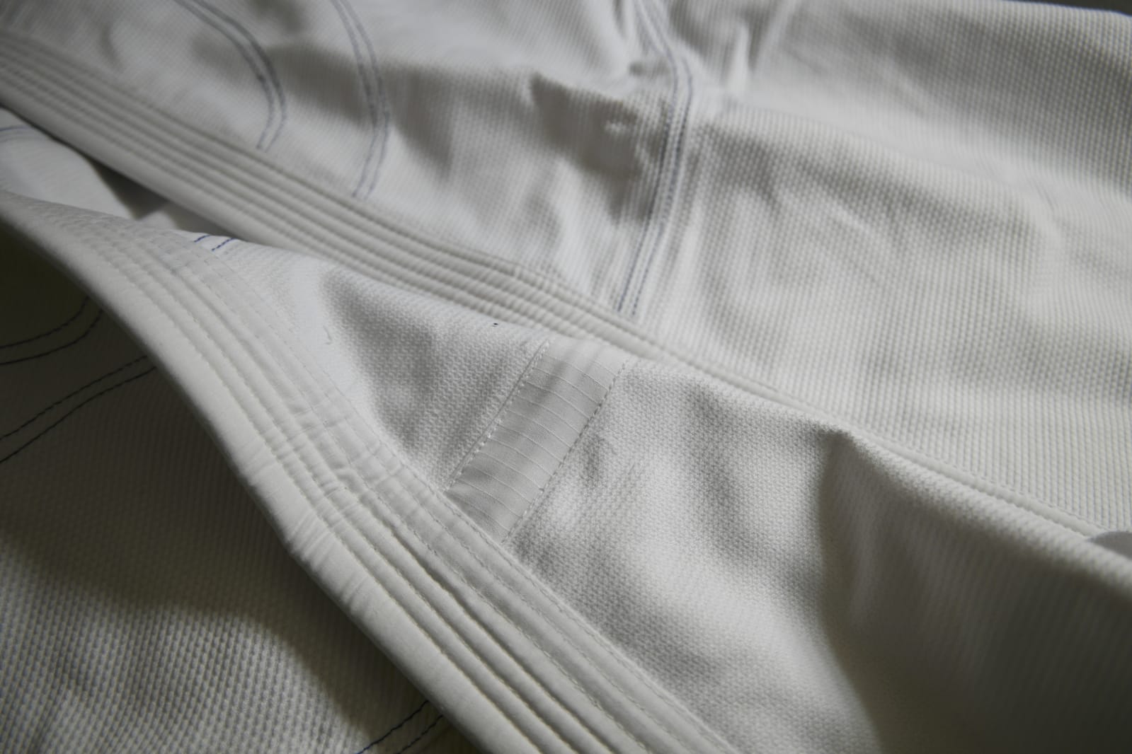 Tissée en pearl weave 100% coton (je rappelle que le pearl weave et le tissage le plus répandu sur les Gi, étant un bon compromis entre légèreté et solidité). Le petit logo sur la manche droite est brodé, la veste ne dispose pas de couture dans le dos, et les surpiqûres sont bleues et assez discrètes. Une doublure intérieure est cousue au niveau des épaules, en coton sergé. Cette couche permet un meilleur confort de la veste lorsque portée sans rashguard en dessous.